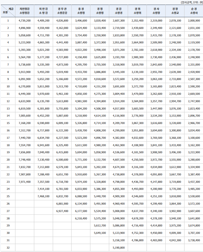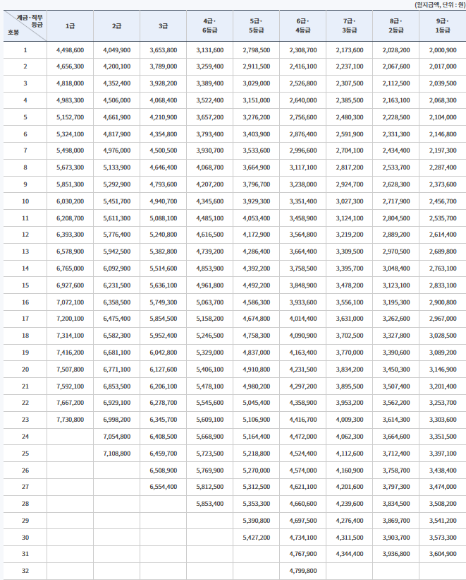 💡 호봉별 급여는 기본급 기준이며, 추가로 지급되는 각종 수당 및 연금 등은 별도로 적용됩니다.